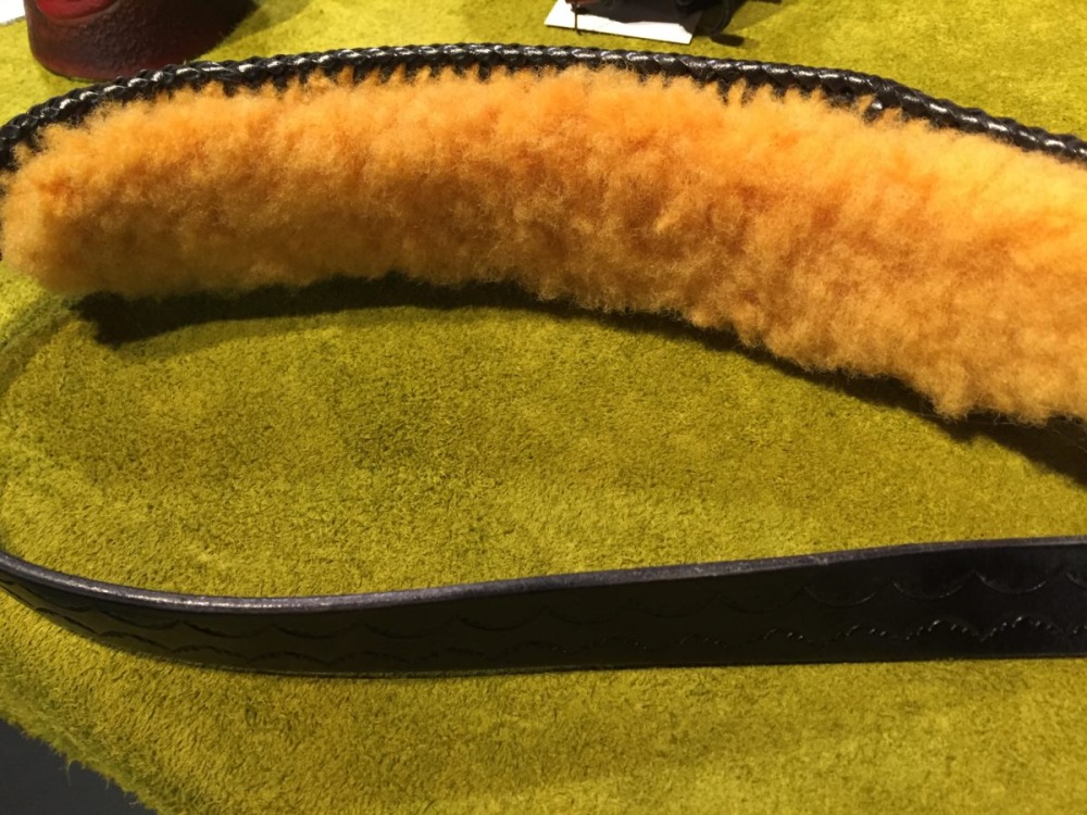 Veg tanned leather dyed black. Sheep wool pad (trim wool with scissor to better fit you) leather laced edge. Western style buckle to adjust length.