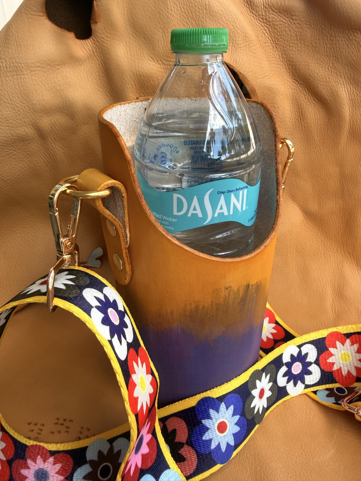 Keep dry. Wipe with soft cloth. Condition occasionally with a leather balm. Sweat from cold bottles may darken leather.